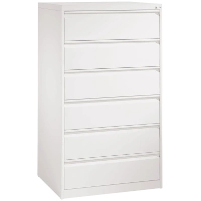 Aus langlebigem Stahl | Zwei- oder dreibahnig für Karteikarten DIN A5 quer | Belastung je Auszug: 50 kg | 6 Schubladen | Auszugssperre | Frontbündig einschlagende, geschlossene Stahlschubladen mit integrierter durchgehender Griffleiste | Wechselschlosszylinder mit 2 Schlüsseln und Zentralverschluss | Voll ausziehbare Schubladen auf langlebigen Kugelrollen-Teleskopschienen | Pro Karteibahn 2 Pendelbleche | Serienmäßig mit Kunststoffgleitern (Fußbodenschutz) | 5 Jahre Garantie